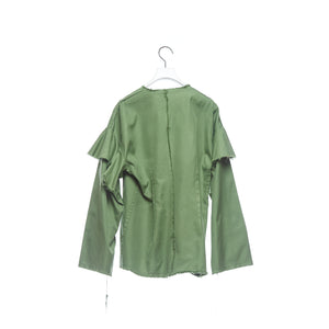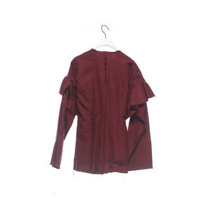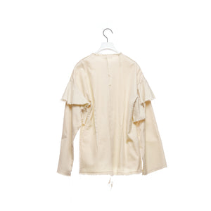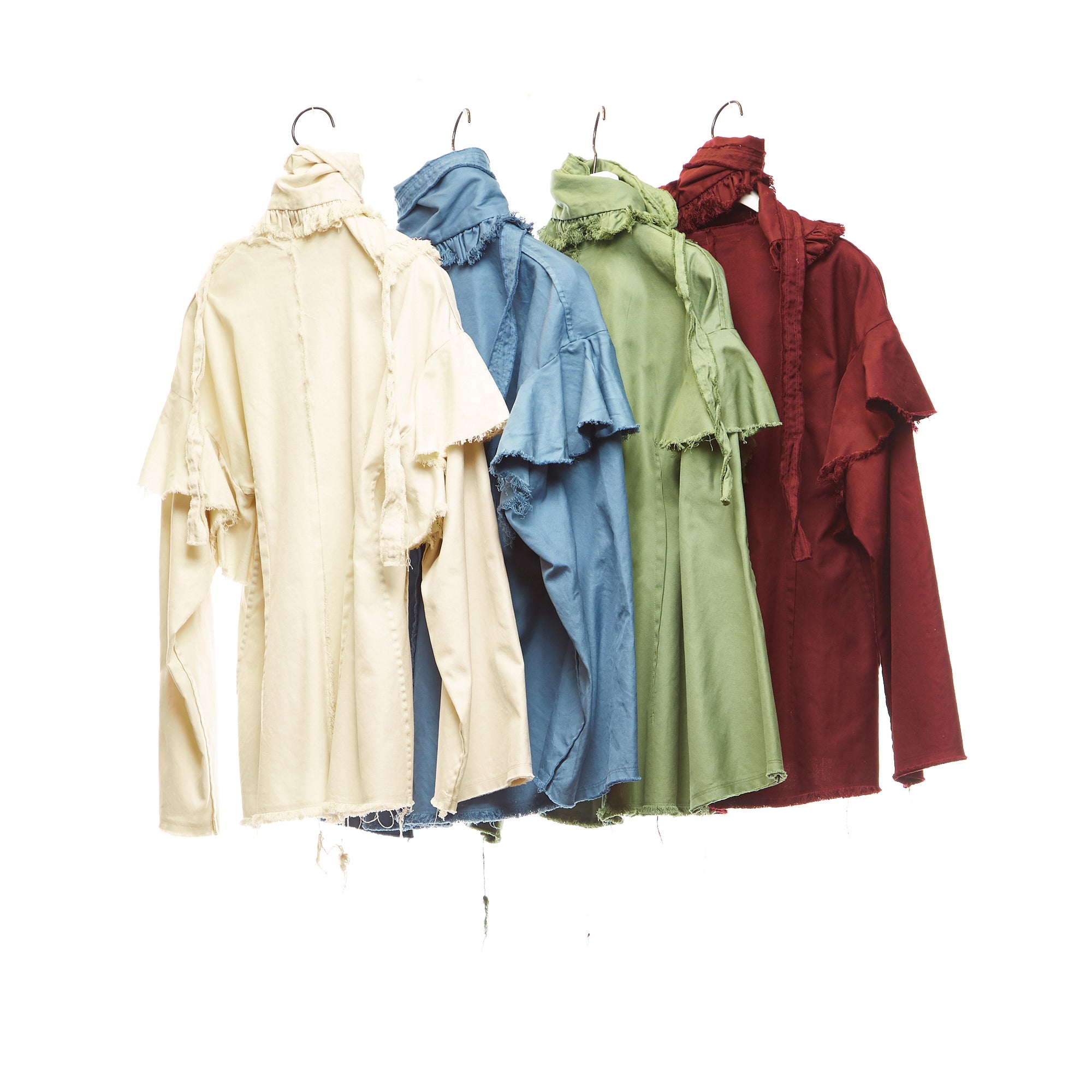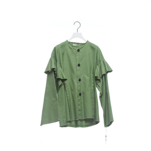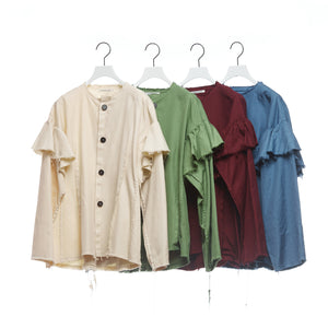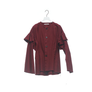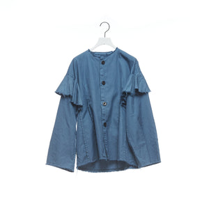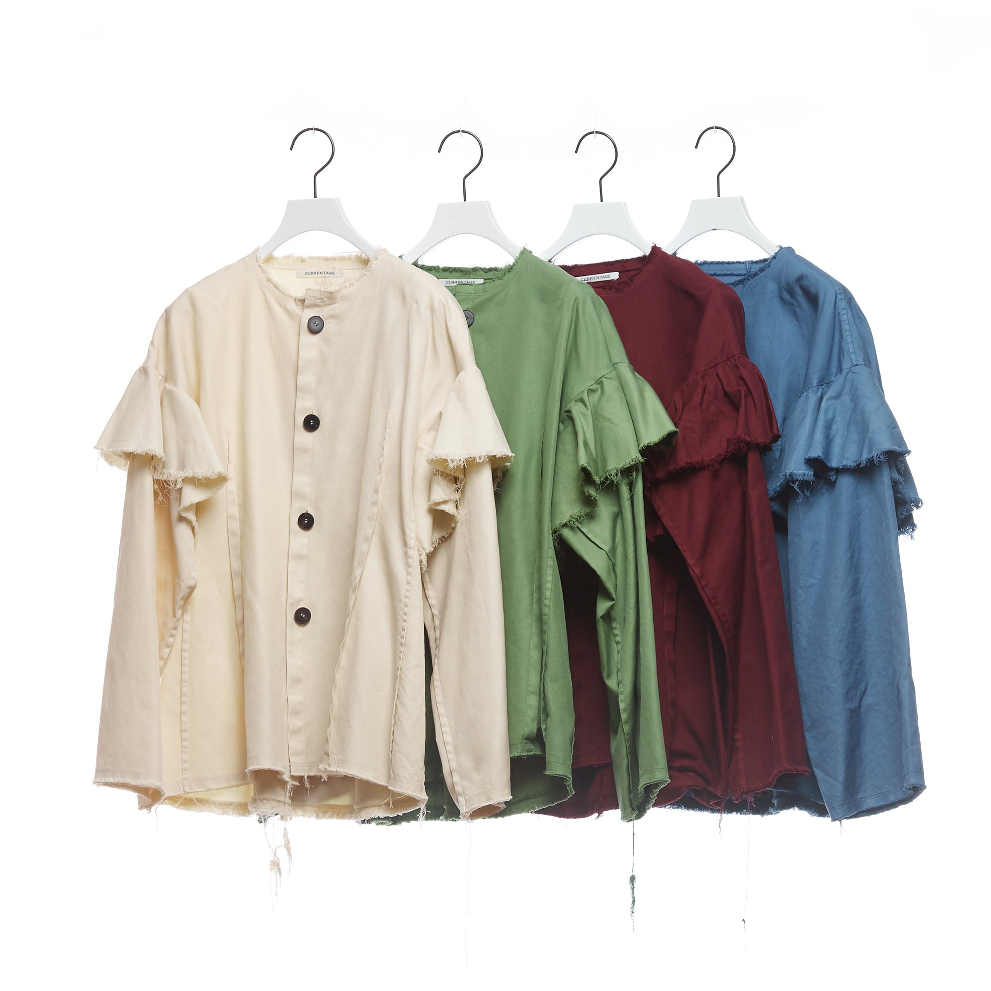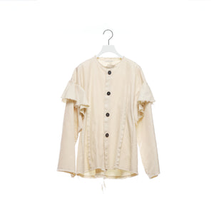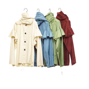 素材のバルキー感を活かしたウエストシェイプされたシルエットの美しいデザイン。ノーカラーで大きめのボタンが施されているので羽織りとしても使えるデザイン。アームホールの大きなラッフル、取り外し可能なフリル襟は巻き方でハイネック風のフリル襟としてももカマーベルトとしても使うことができます。気分で色々な着方をしてもらえる1枚。