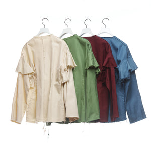 フィンクス糸を3本撚りにした贅沢なオックス。通常は2本撚りのところ3本撚りにすることでオックス目が立ちフィンクス糸の光沢感が際立ちます。あえて綺麗に仕上げず、製品染めすることで更に目を詰めて風合いを出しています。色は敢えて王道でなく少し外した色で表現。絶妙なクリームカラー、グレイッシュなブルー、絶妙なグリーン、バーガンディーの4色展開。