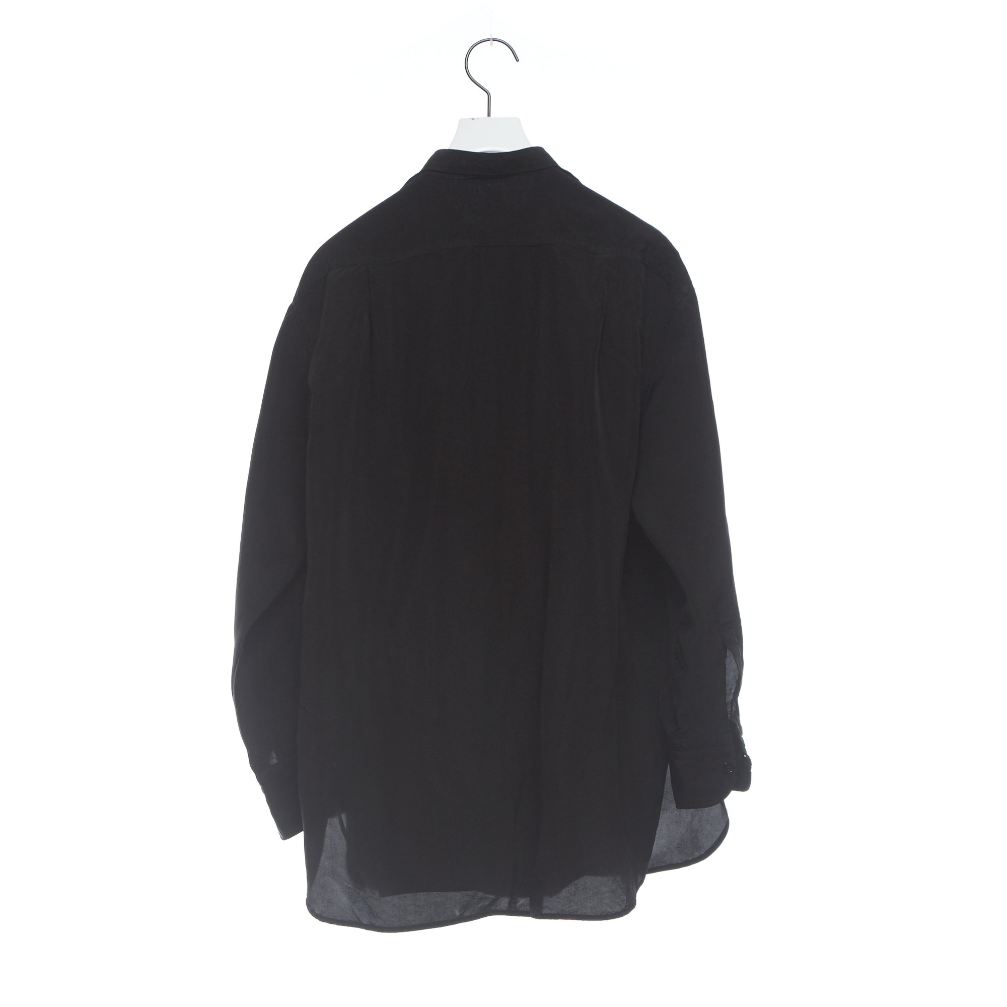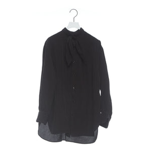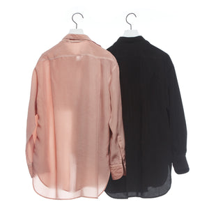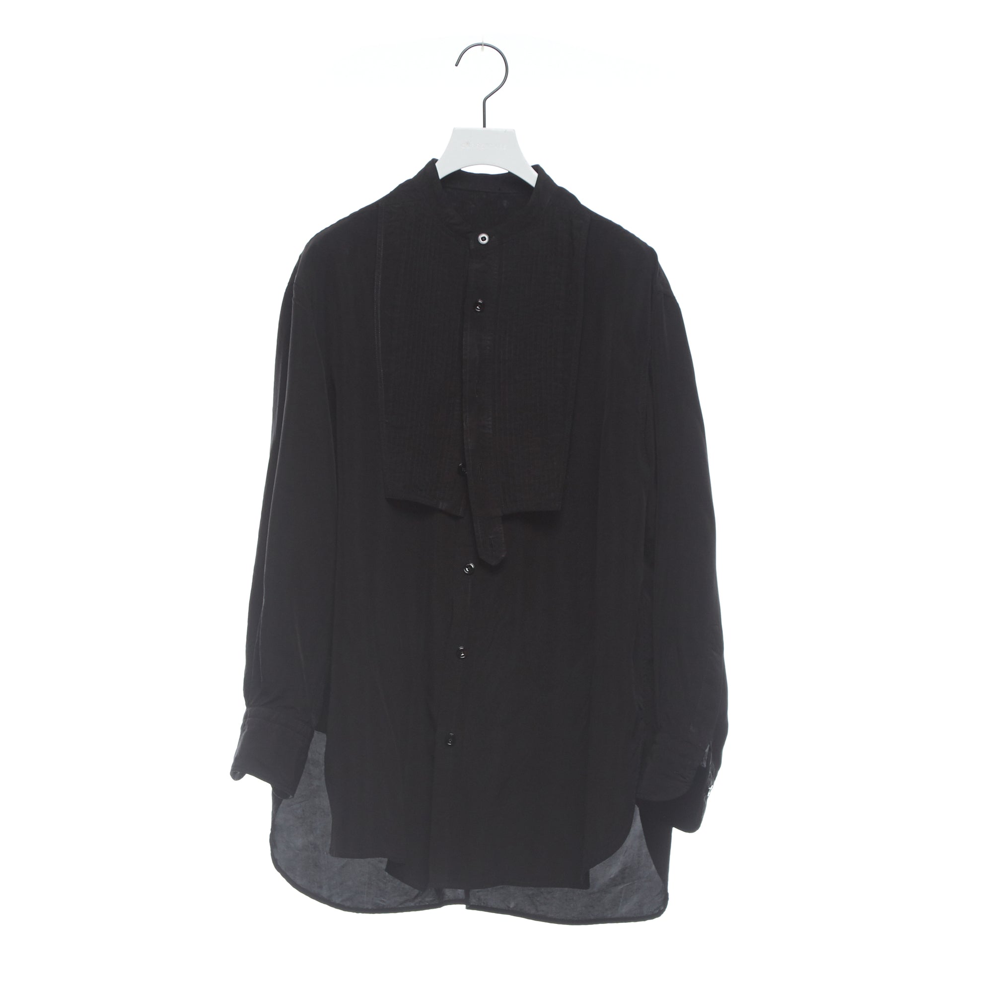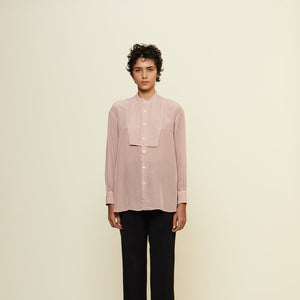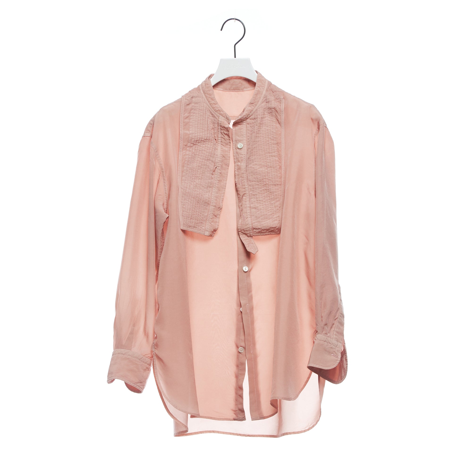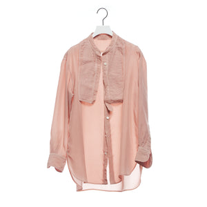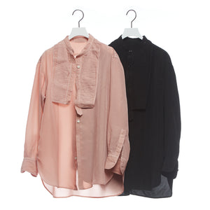 ヴィンテージのメンズのドレスシャツからの着想デザイン。アメリカの古いシャツの本に出会ったことから知ったドレスシャツの様々なディテール。かつての男たちはTPOや気分に合わせて襟を外したり付けたりととてもおしゃれだったのだとインスパイアされたことから生まれた着せ替えシャツ。ボザムのプリーツパーツ、スカーフ付きの取り外し襟は取り外し可能。全てを取り外すとシンプルなスタンドカラーシャツになります。